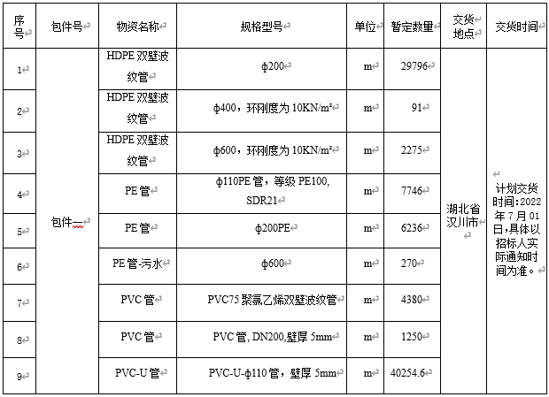 1.2 招標內容:本次管材采購招標內容詳見下表。