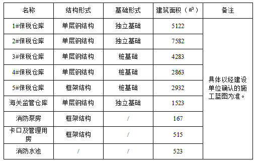 二標段:3、4#保稅倉庫土建及鋼結構、金屬屋面、機電安裝工程,包含施工圖示散水以內(含散水,不含樁基)的所有鋼筋、混凝土勞務,模板、支持及相關全部腳手架,樓地面及墻柱面裝修、門窗工程,鋼結構、預埋螺栓、金屬墻面及屋面,機電安裝(消防工程除外)及坡道臺階等達到竣工交付標準的所有工程內容和工作內容,同時配合招標人辦理竣工資料、施工圖預算、結算等工作。