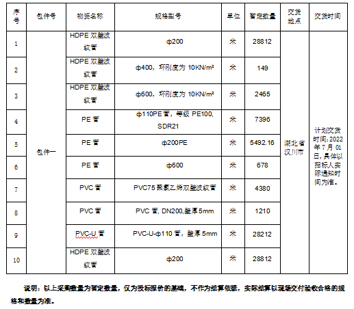 1.2 招標內容:本次管材采購招標內容詳見下表。