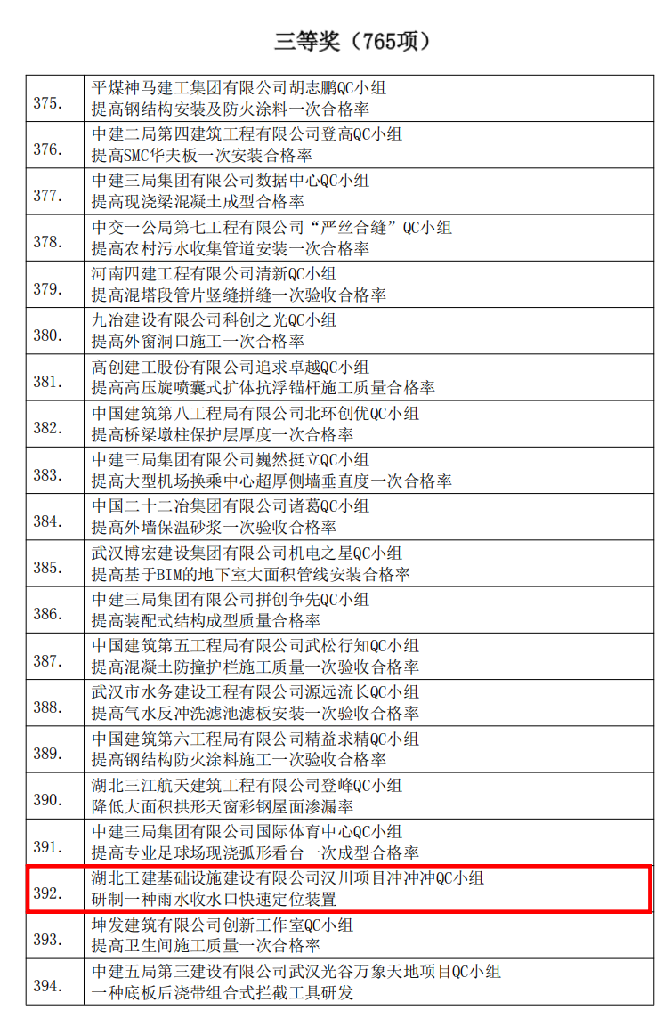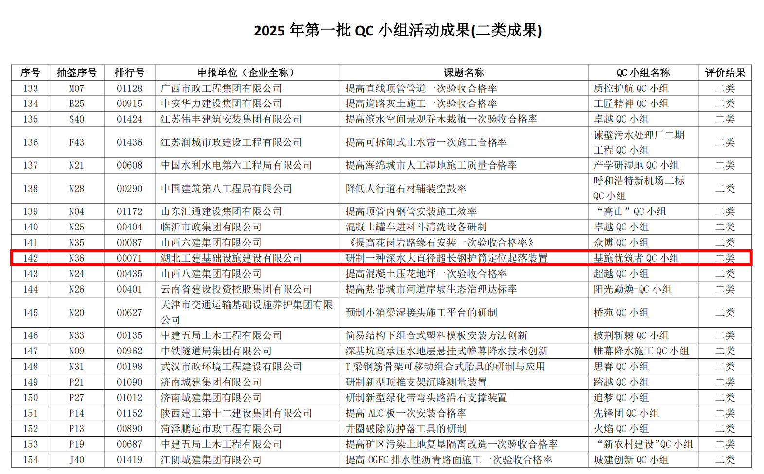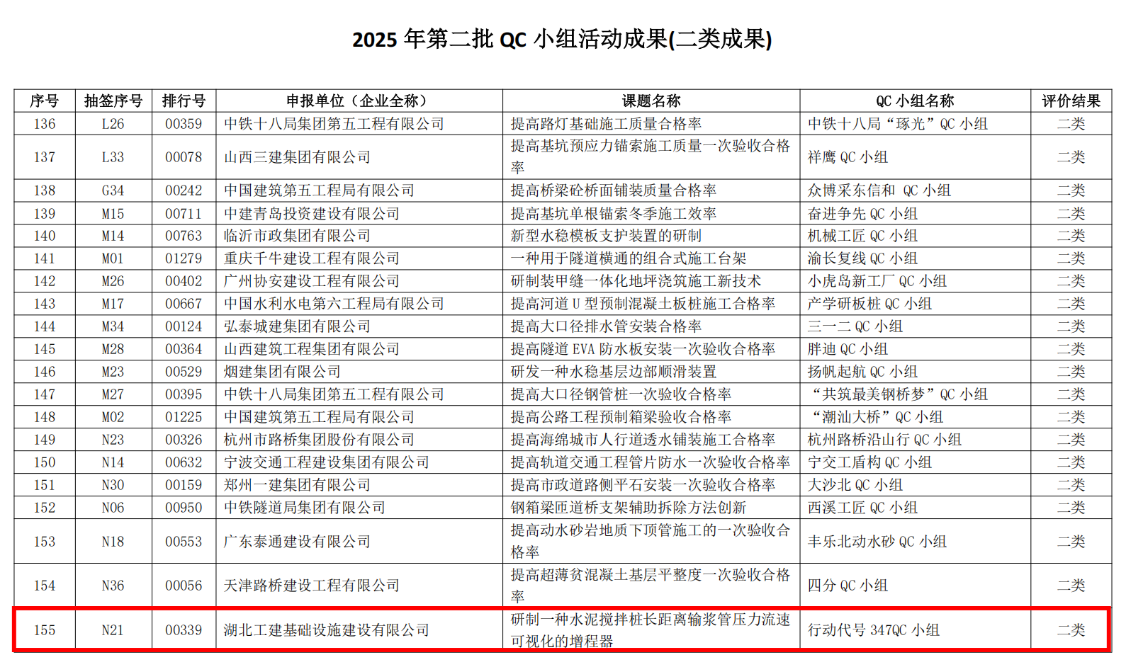 捷報頻傳!近日,基礎設施公司憑借突出表現斬獲國家級QC成果獎項3項。其中《研制一種深水大直徑超長鋼護筒定位起落裝置》和《研制一種水泥攪拌樁長距離輸漿管壓力流速可視化的增程器》獲得中國市政工程協會Ⅱ類QC成果,《研制一種雨水收水口快速定位裝置》獲得中國建筑業協會三等獎。